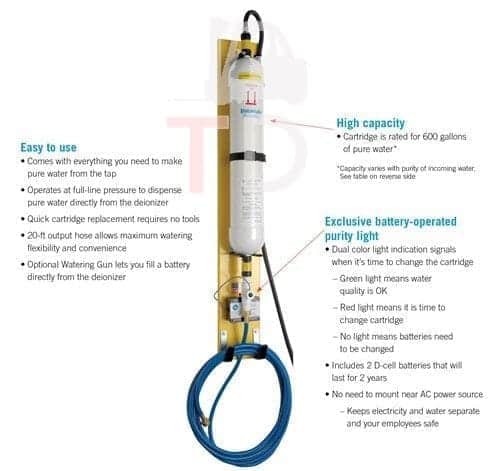 Demineralized water device, to filter tap water into demineralized water which can be used to refill your wet lead-acid batteries.